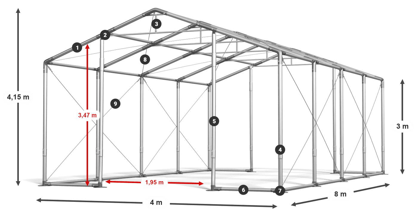Silný tarpaulin je vyroben z PVC s vysokou hmotností. Má estetická okna vitráže, která poskytují hodně denního světla. Elegantní opláštění se používá ve stranických stanech, gastronomických stanech a obchodních stanech. Vodotěsný a UV -rezistentní plachta chrání stoly a bufety a poskytuje hostům suchý a stinný prostor. Stan s okny z vitráže je také vynikající zahradní altán.