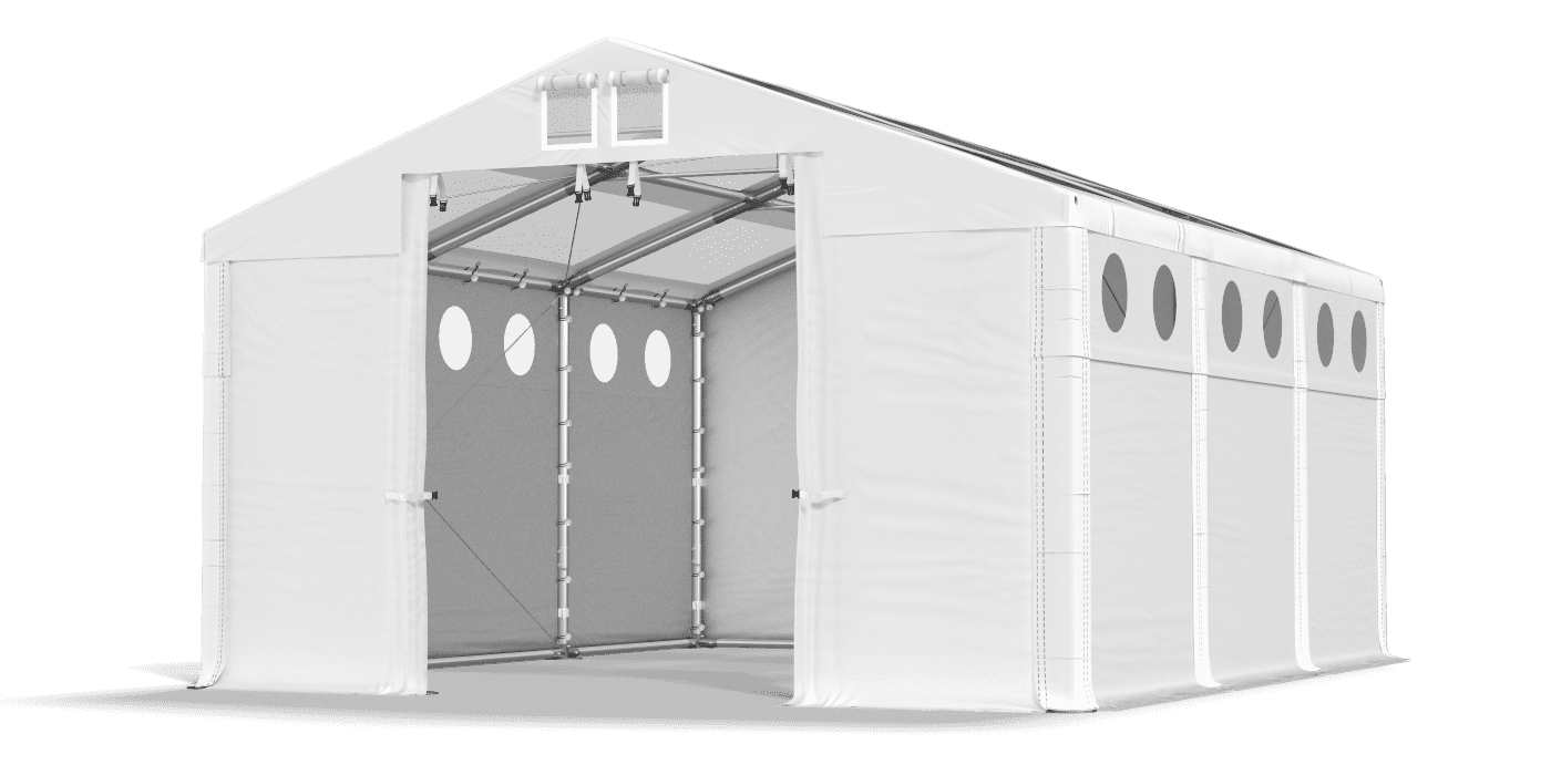 Tarpaulin s průhlednou střechou a osvětlovací okny zajišťuje pohodlné pracovní podmínky ve stanu. Opád je vyroben ze silného PVC, který chrání skladované zboží před vlhkostí, UV zářením a znečištěním. Průhledná střecha a kulatá okna v bočních stěnách zajišťují optimální osvětlení. Tarpaulin byl vybaven systémem snadné změny v délce Multi-size.
