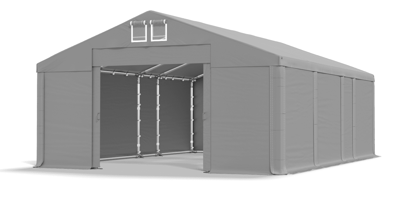 Odolný, tvrdý tarpaulin tarpaulin z PVC poskytuje bezpečné podmínky pro skladování stavebních materiálů, komerčního zboží, vozidel a zemědělských strojů. Full -bez opláštění bez oken je extrémně těsné, vodotěsné a neprochází denním světlem. Interiér skladového stanu je pro kolemjdoucí neviditelný. Jedná se o vynikající garážový stan a průmyslová hala. Tarpaulin má systém rychlé délky změny Multi-size.