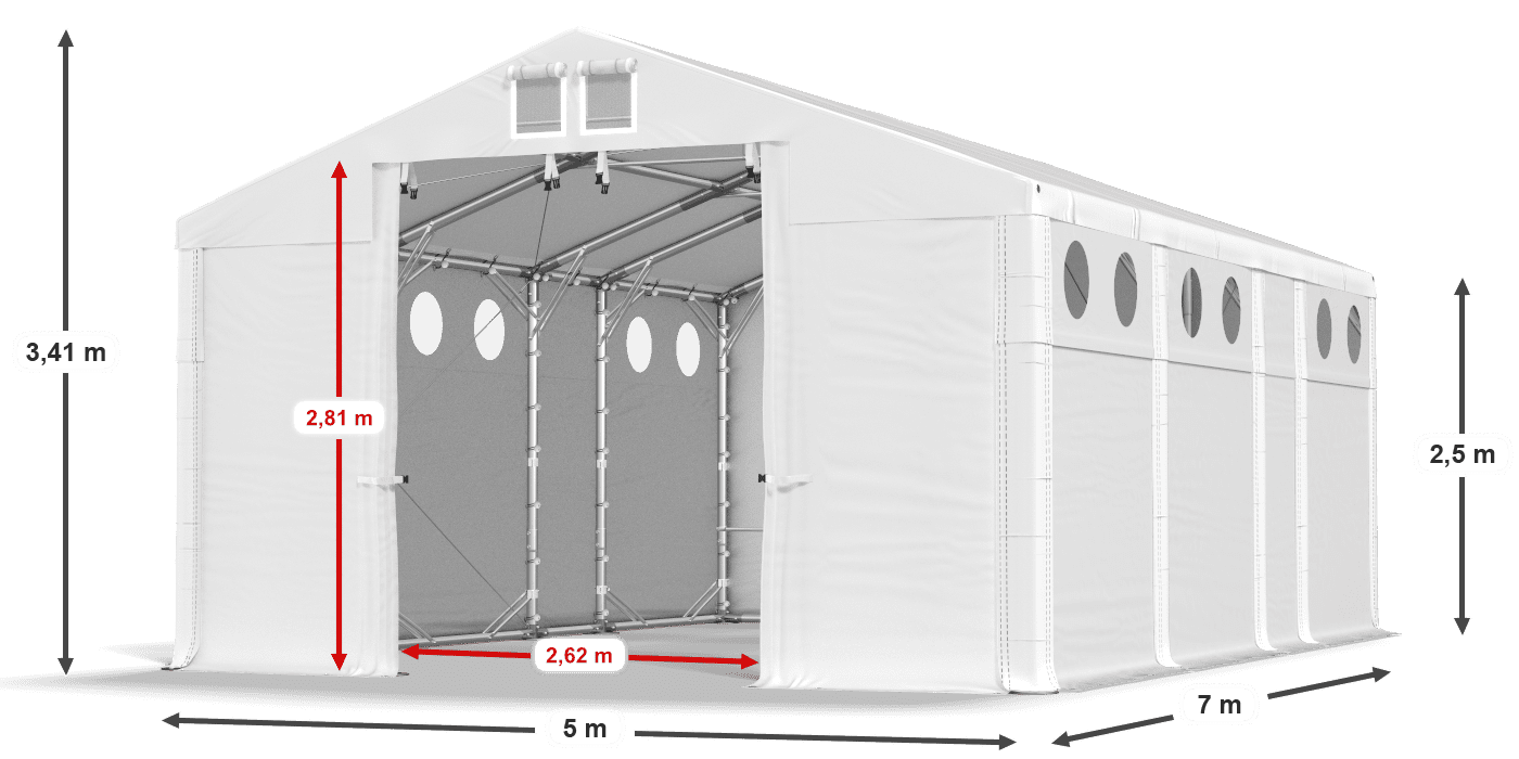 Tarpaulin s malými kulatými okny zajišťuje příliv přirozeného světla do vnitřku skladového stanu. V horní části bočních stěn jsou umístěna malá osvětlovací okna. Díky tomu je interiér skladového stanu neviditelný pro kolemjdoucí. Těsné a odolné opláštění je vyrobeno ze silného, vodotěsného PVC. Díky tomu můžeme ukládat stavební materiály, nástroje, plodiny, sportovní vybavení a suroviny a komerční zboží.