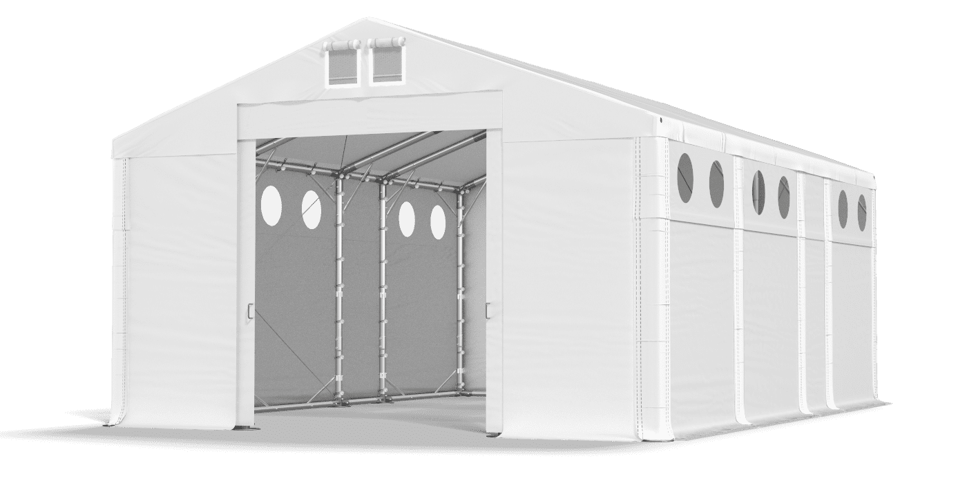 Silné opláštění s osvětlujícími okny umožňuje garáž vozidel, skladování zboží a provádění prací souvisejících s montáží. Tvrdý -tarpaulin tarpaulin vyrobený z PVC je nepromokavý, těsný a odolný vůči UV záření. V suchém a stínovaném skladovém stanu můžeme ukládat plodiny, stavební materiály a suroviny. Okna kulatého osvětlení poskytuje přirozené světlo. Tarpaulin má systém rychlé délky změny Multi-size.