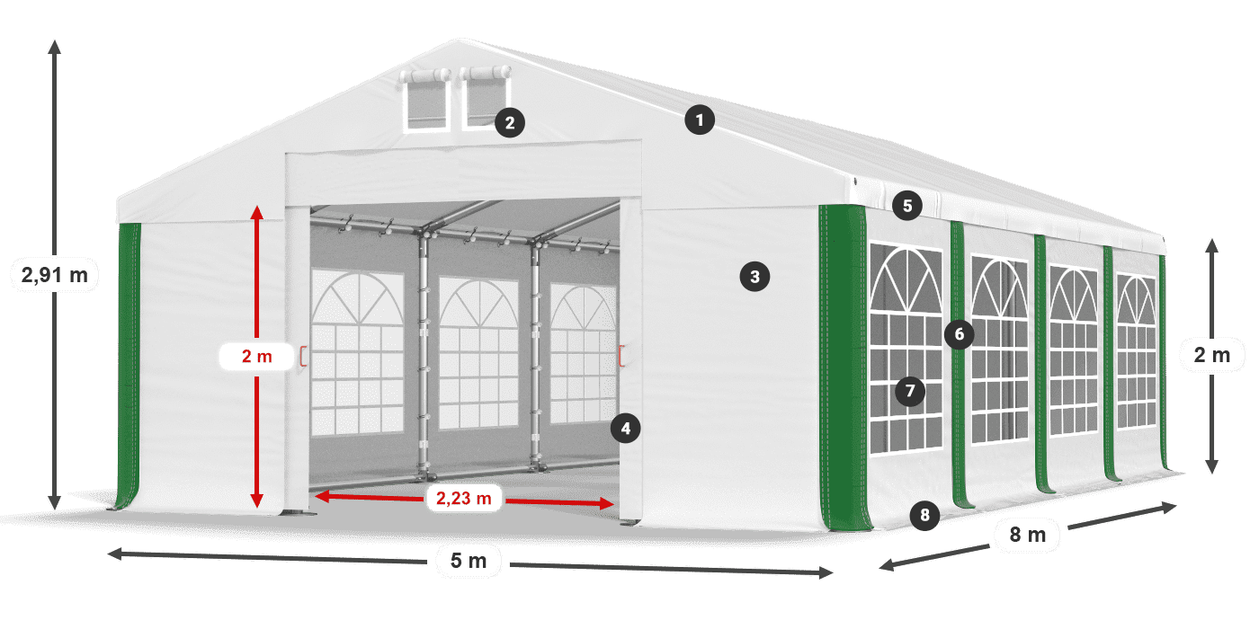 Silný tarpaulin je vyroben z PVC s vysokou hmotností. Má estetická okna vitráže, která poskytují hodně denního světla. Elegantní opláštění se používá ve stranických stanech, gastronomických stanech a obchodních stanech. Vodotěsný a UV -rezistentní plachta chrání stoly a bufety a poskytuje hostům suchý a stinný prostor. Stan s okny z vitráže je také vynikající zahradní altán.