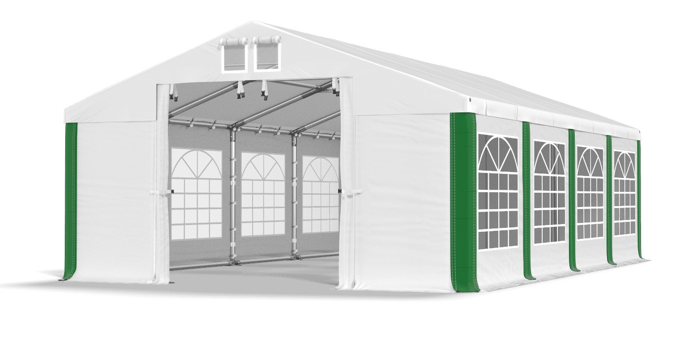 Silný tarpaulin je vyroben z PVC s vysokou hmotností. Má estetická okna vitráže, která poskytují hodně denního světla. Elegantní opláštění se používá ve stranických stanech, gastronomických stanech a obchodních stanech. Vodotěsný a UV -rezistentní plachta chrání stoly a bufety a poskytuje hostům suchý a stinný prostor. Stan s okny z vitráže je také vynikající zahradní altán.