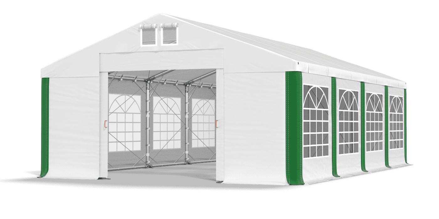 Silné opláštění okny z barevného skla chrání stoly a bufety před vlhkostí a větrem. Uzavřený plachta z PVC je odolný vůči UV záření, a proto poskytuje suchý a stinný prostor. Ve večírku můžeme organizovat rodinné večírky, komunální festivaly a firemní bankety. Je to také vynikající zahradní stan a komerční stan. Elegantní tarpaulin je vybaven systémem snadné změny délky Multi-size.