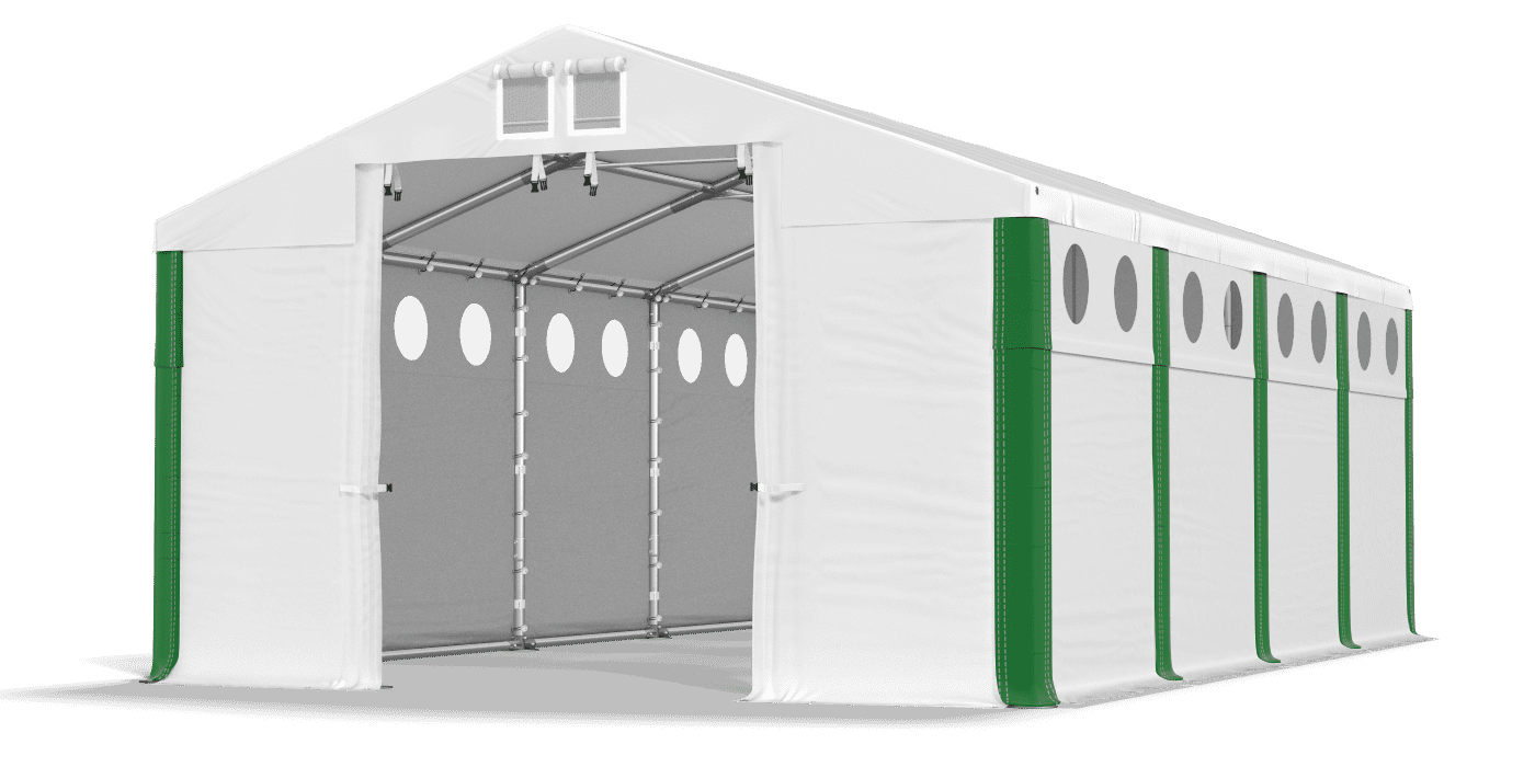 Opláštění s osvětlujícími okny zaručuje dodávku denního světla do vnitřku úložného stanu. Pevný tarpaulin PVC je odolný vůči vlhkosti a UV záření. Pod střechou můžete ukládat zboží, provádět opravy a provádět práce související s výrobou a segregací. Otečení bylo vybaveno systémem snadné změny délky Multi-size. Malá kulatá okna jsou umístěna do horní části bočních stěn, a proto není pro kolemjdoucí viditelný interiér garážového stanu.