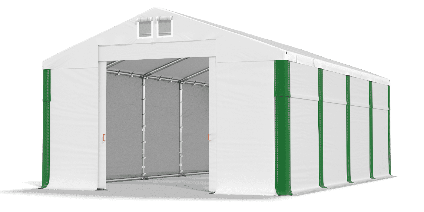 Odolný, tvrdý tarpaulin tarpaulin z PVC poskytuje bezpečné podmínky pro skladování stavebních materiálů, komerčního zboží, vozidel a zemědělských strojů. Full -bez opláštění bez oken je extrémně těsné, vodotěsné a neprochází denním světlem. Interiér skladového stanu je pro kolemjdoucí neviditelný. Jedná se o vynikající garážový stan a průmyslová hala. Tarpaulin má systém rychlé délky změny Multi-size.
