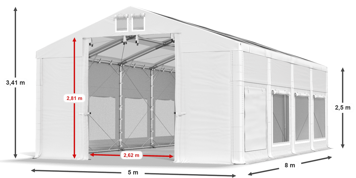 Výšky úložných a párty stanů lze rychle měnit díky modulární konstrukci, která umožňuje zvednout stan o 0,5 m nebo 1 m. Nejnižší možná výška boční stěny je 2m a nejvyšší 4m.