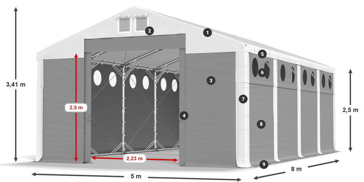 Tarpaulin s okny s kulatým osvětlením poskytuje přirozené světlo uvnitř stanu. Je vyroben z PVC s vysokou hmotností. Opád je odolný vůči vlhkosti a UV záření, a proto poskytuje suchý a stinný prostor pro skladování zboží, plodin, krmivo a stavební materiály. Je to také vynikající garážový stan pro vozidla, zemědělské stroje a sportovní vybavení. Interiér skladového stanu není viditelný pro kolemjdoucí, protože okna jsou umístěna do horní části bočních stěn.