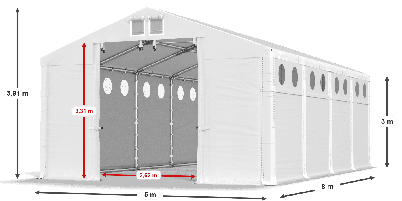 Silné opláštění s osvětlujícími okny umožňuje garáž vozidel, skladování zboží a provádění prací souvisejících s montáží. Tvrdý -tarpaulin tarpaulin vyrobený z PVC je nepromokavý, těsný a odolný vůči UV záření. V suchém a stínovaném skladovém stanu můžeme ukládat plodiny, stavební materiály a suroviny. Okna kulatého osvětlení poskytuje přirozené světlo. Tarpaulin má systém rychlé délky změny Multi-size.