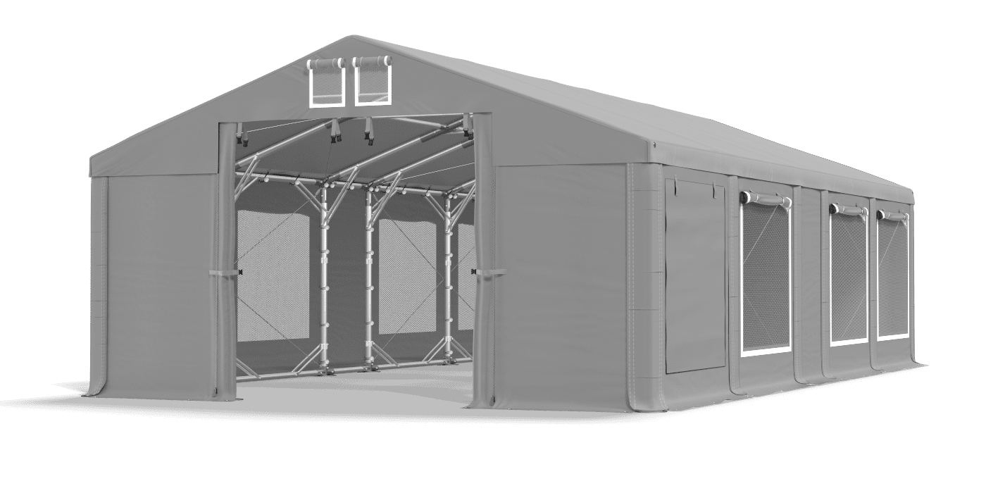Střešní a boční napínací systém se skládá ze silných ocelových lan s napínáky. Výsledkem je extrémně odolná konstrukce, která se nedeformuje a zůstává kompaktní po celou dobu používání.