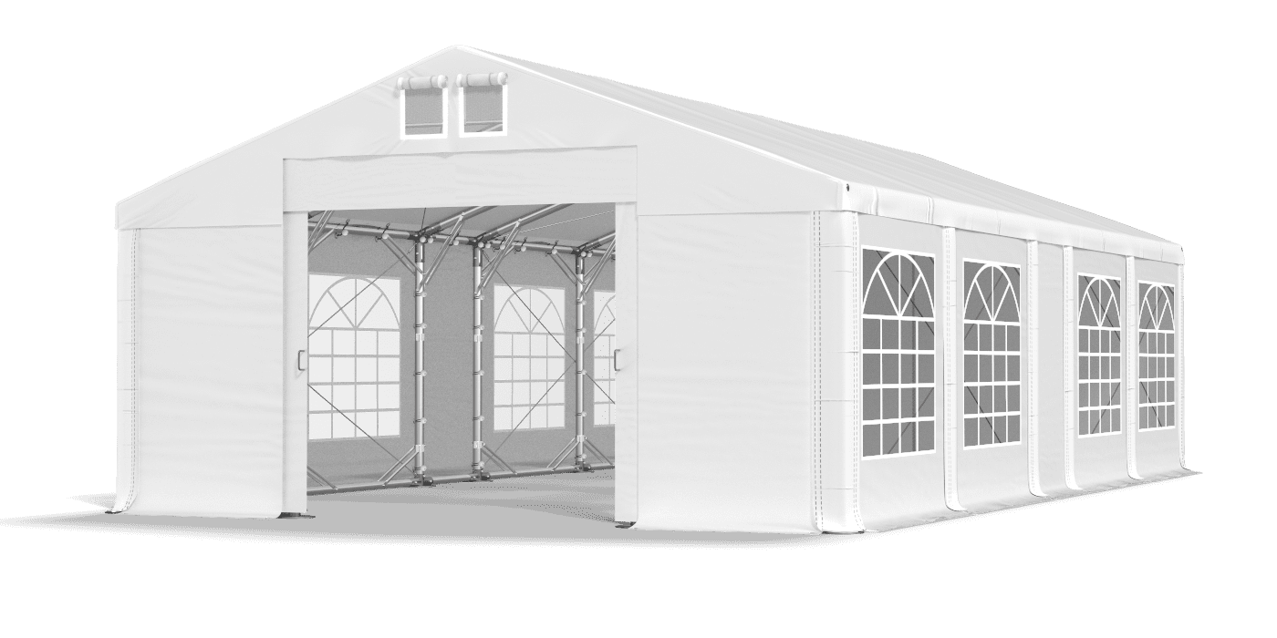 Odolný plachta s okny z vitráže, chrání stoly a bufety před vlhkostí, větrem a UV zářením. Opláštění je vyrobeno ze silného PVC. Elegantní okna z barevného skla jsou dekorací večírku a poskytují také hodně přirozeného světla. Bleghtningové opláštění zvyšuje bezpečnost při používání stanu pro gastronomické a cateringové účely. Tarpaulin má systém rychlé délky změny Multi-size.