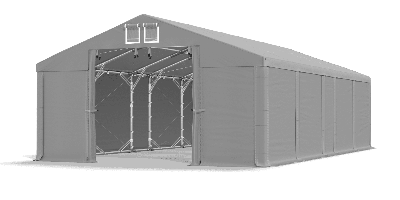Odolný, tvrdý tarpaulin tarpaulin z PVC poskytuje bezpečné podmínky pro skladování stavebních materiálů, komerčního zboží, vozidel a zemědělských strojů. Full -bez opláštění bez oken je extrémně těsné, vodotěsné a neprochází denním světlem. Interiér skladového stanu je pro kolemjdoucí neviditelný. Jedná se o vynikající garážový stan a průmyslová hala. Tarpaulin má systém rychlé délky změny Multi-size.