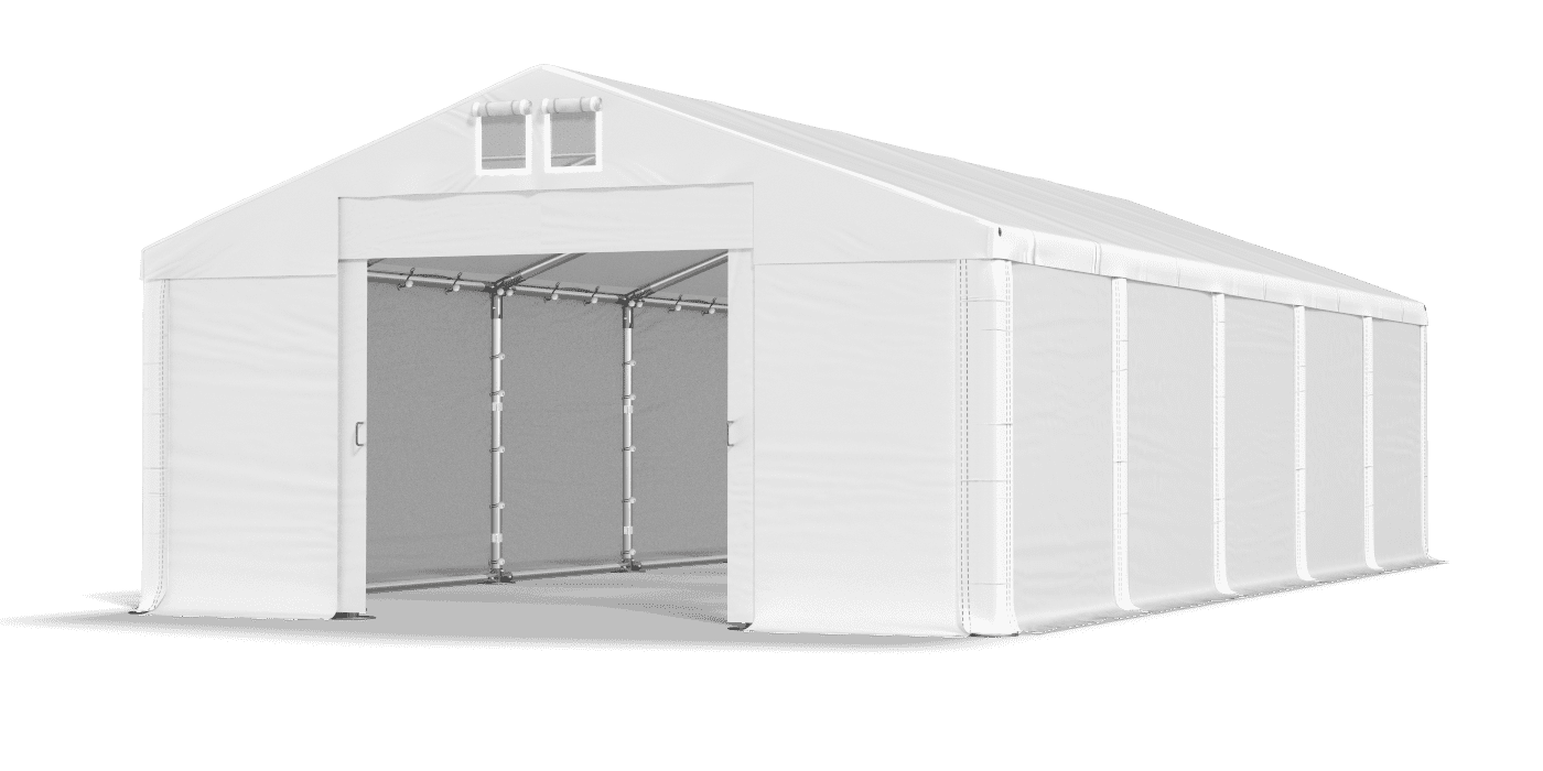Silný, plný plachta s PVC chrání obsah stanu před znečištěním a vlivem vlhkosti a UV záření. Těsné opláštění skladového stanu vám umožňuje ukládat zboží, garážová vozidla. Široká retenční zástěra zlepšuje drenáž vody během srážek a dvojité ventilátory regulují výměnu vzduchu. Tarpaulin nemá žádná okna, která zabraňuje stanu zvenčí.