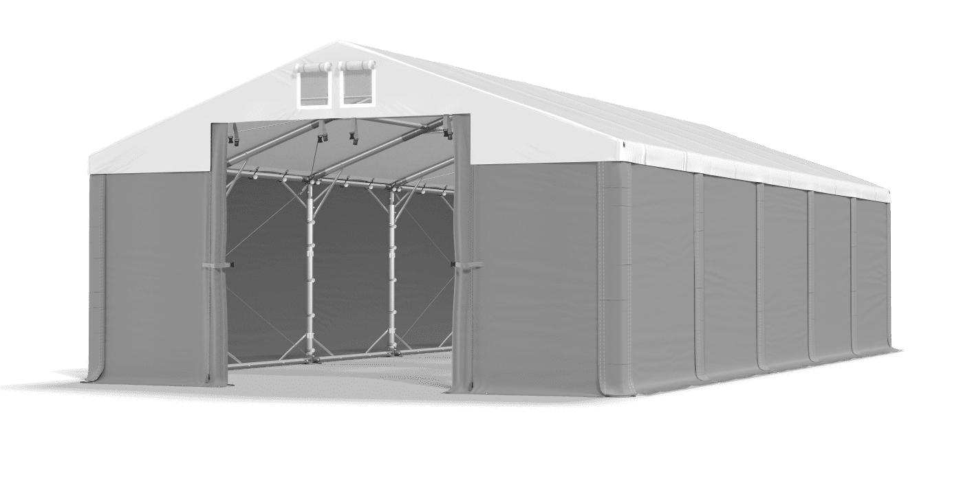 Odolný, tvrdý tarpaulin tarpaulin z PVC poskytuje bezpečné podmínky pro skladování stavebních materiálů, komerčního zboží, vozidel a zemědělských strojů. Full -bez opláštění bez oken je extrémně těsné, vodotěsné a neprochází denním světlem. Interiér skladového stanu je pro kolemjdoucí neviditelný. Jedná se o vynikající garážový stan a průmyslová hala. Tarpaulin má systém rychlé délky změny Multi-size.