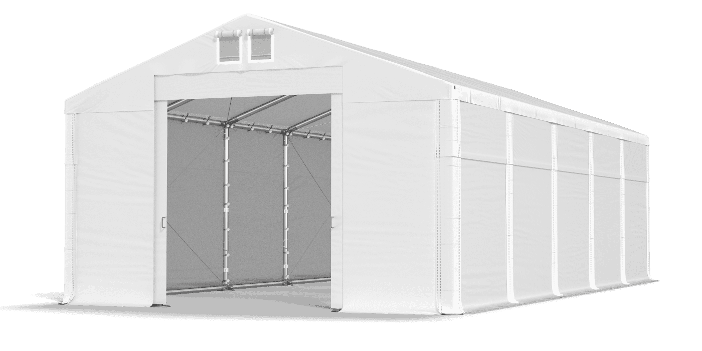 Plné opláštění bez oken je vyrobeno z PVC s vysokou hmotností. Tarpaulin je vodotěsný a odolný vůči UV záření. Proto můžeme ve skladovacím stanu ukládat stavební materiály, zemědělské plodiny, suroviny a komerční zboží. Pod střechou můžeme garážová vozidla, zahradní nábytek a sportovní vybavení. Tarpaulin bez oken je extrémně těsný a také chrání obsah zastřešení před nahlédnutím z vnějšku.