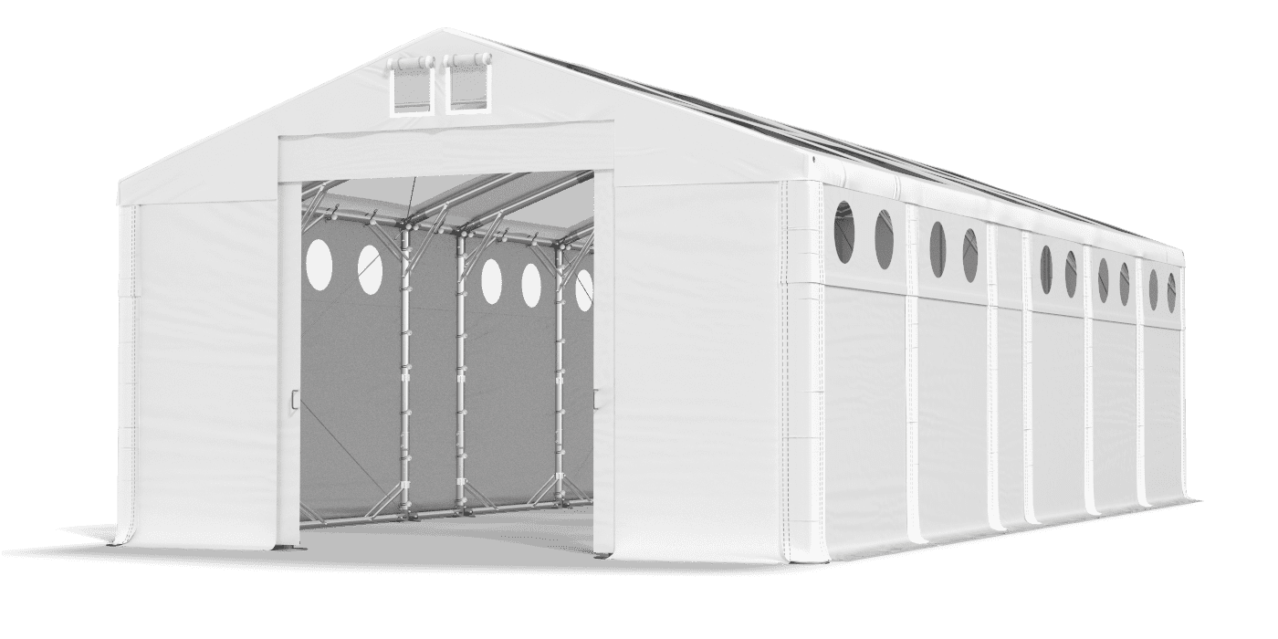 Tarpaulin je vybaven malými osvětlovacími okny a průhlednou střechou. Díky tomu je interiér skladového stanu dobře osvětlený a zároveň neviditelný pro cizince. Opád je vyroben z odolného PVC, odolný vůči vlhkosti a UV záření. Těsný garážový stan umožňuje ukládat komerční zboží, sportovní vybavení a vozidla. Pod střechou lze provádět práce související se montáží, výrobou a segregací. Otečení bylo vybaveno systémem snadné změny délky Multi-size.