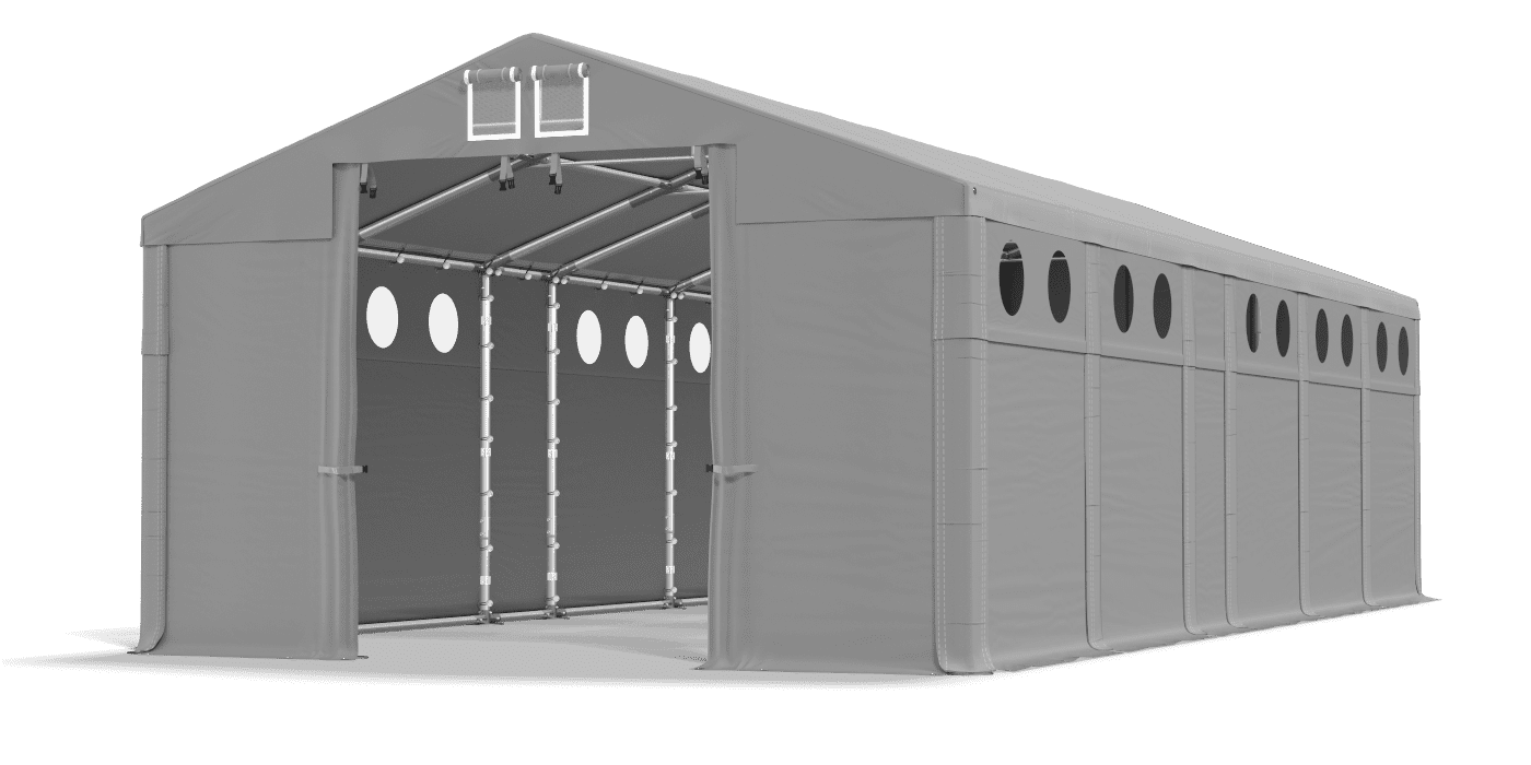 Silné opláštění s osvětlujícími okny umožňuje garáž vozidel, skladování zboží a provádění prací souvisejících s montáží. Tvrdý -tarpaulin tarpaulin vyrobený z PVC je nepromokavý, těsný a odolný vůči UV záření. V suchém a stínovaném skladovém stanu můžeme ukládat plodiny, stavební materiály a suroviny. Okna kulatého osvětlení poskytuje přirozené světlo. Tarpaulin má systém rychlé délky změny Multi-size.
