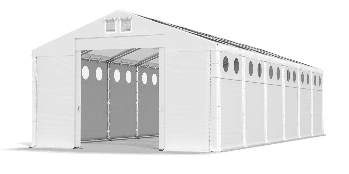Tarpaulin s průhlednou střechou a osvětlovací okny zajišťuje pohodlné pracovní podmínky ve stanu. Opád je vyroben ze silného PVC, který chrání skladované zboží před vlhkostí, UV zářením a znečištěním. Průhledná střecha a kulatá okna v bočních stěnách zajišťují optimální osvětlení. Tarpaulin byl vybaven systémem snadné změny v délce Multi-size.