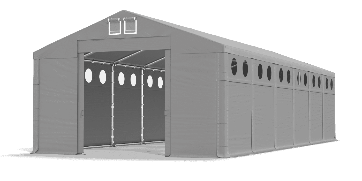 Tento typ stanů dobře poslouží jako dílenský stan, ve kterém probíhají například svářečské práce. V horní části přístřešku jsou kulatá okénka, díky kterým dochází dovnitř stanu k přílivu denního světla.