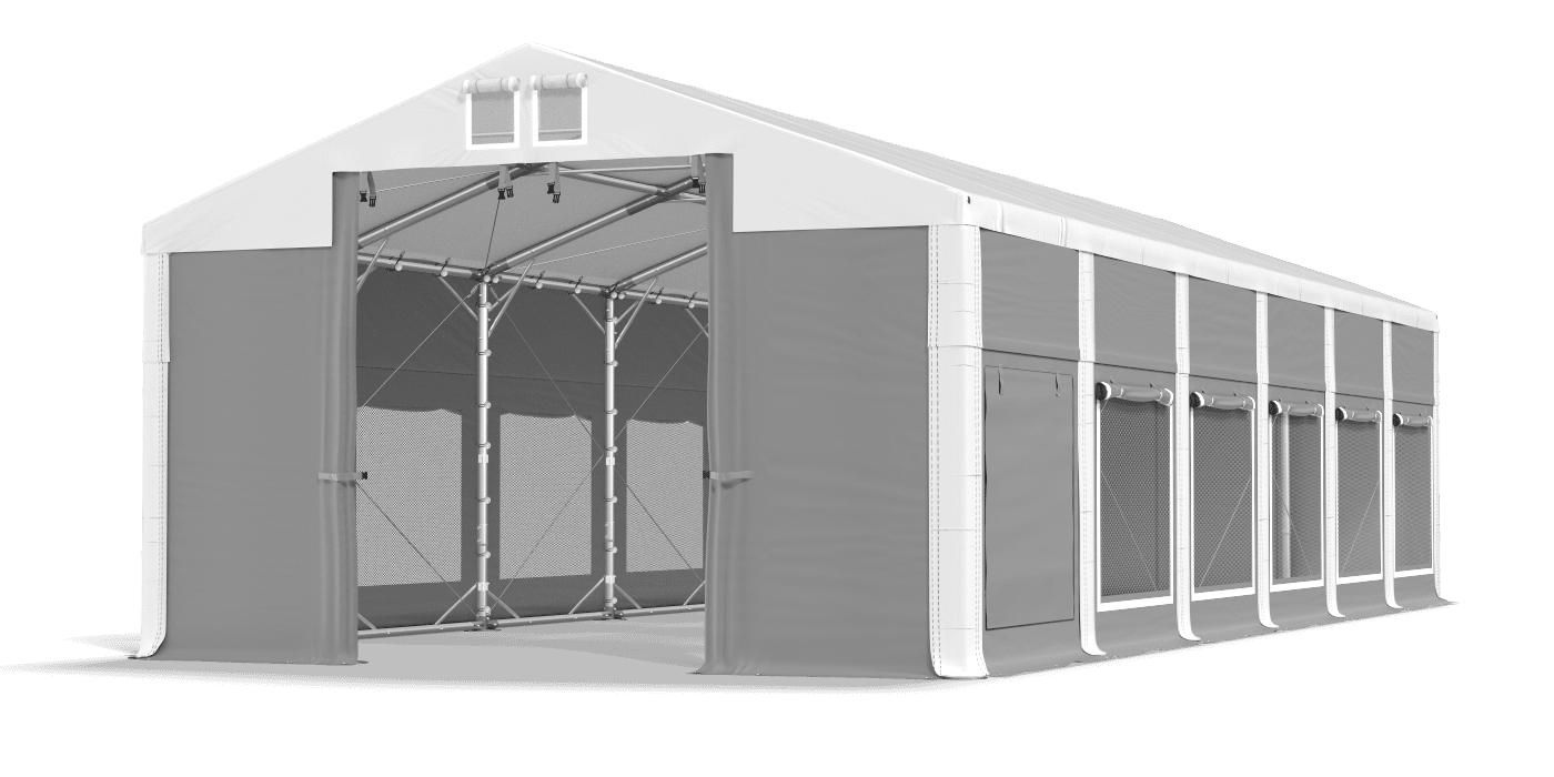 Na všech bočních stěnách byly použity přídavné horní a spodní příčné podpěry. Díky nim je stan chráněn proti silnějším poryvům větru.