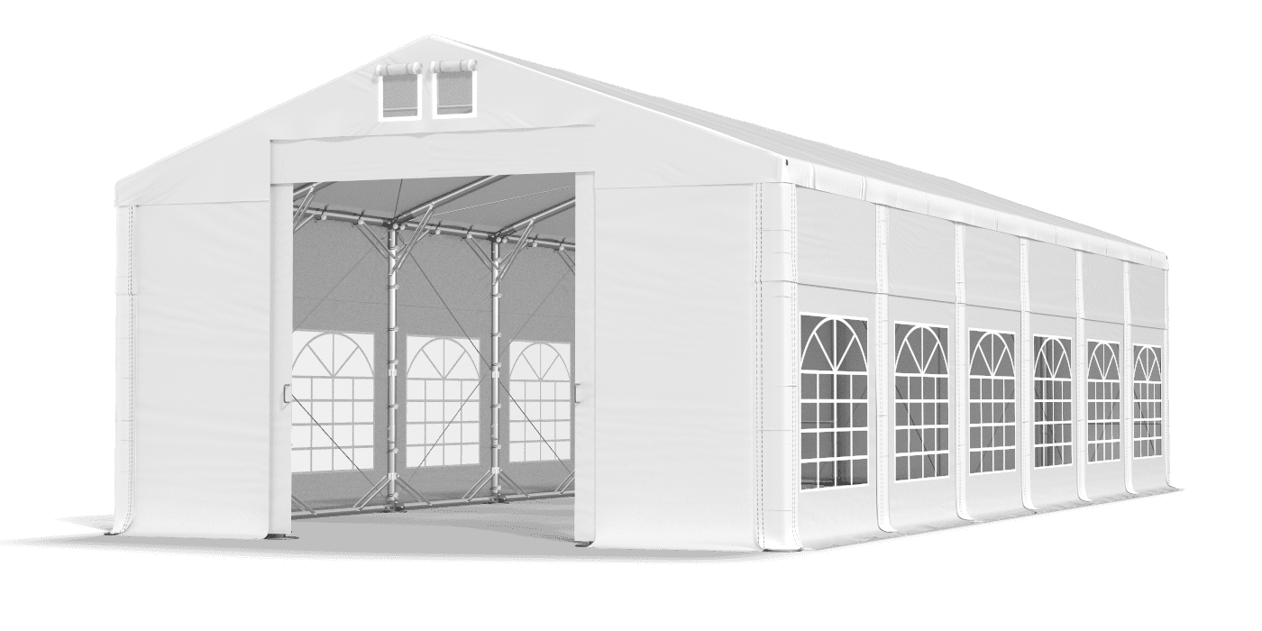 Silný tarpaulin je vyroben z PVC s vysokou hmotností. Má estetická okna vitráže, která poskytují hodně denního světla. Elegantní opláštění se používá ve stranických stanech, gastronomických stanech a obchodních stanech. Vodotěsný a UV -rezistentní plachta chrání stoly a bufety a poskytuje hostům suchý a stinný prostor. Stan s okny z vitráže je také vynikající zahradní altán.