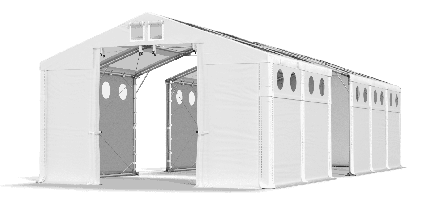 Tarpaulin s průhlednou střechou a osvětlovací okny zajišťuje pohodlné pracovní podmínky ve stanu. Opád je vyroben ze silného PVC, který chrání skladované zboží před vlhkostí, UV zářením a znečištěním. Průhledná střecha a kulatá okna v bočních stěnách zajišťují optimální osvětlení. Tarpaulin byl vybaven systémem snadné změny v délce Multi-size.