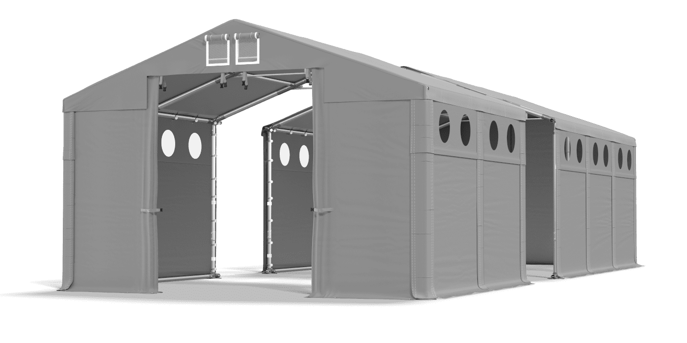 Tento typ stanů dobře poslouží jako dílenský stan, ve kterém probíhají například svářečské práce. V horní části přístřešku jsou kulatá okénka, díky kterým dochází dovnitř stanu k přílivu denního světla.