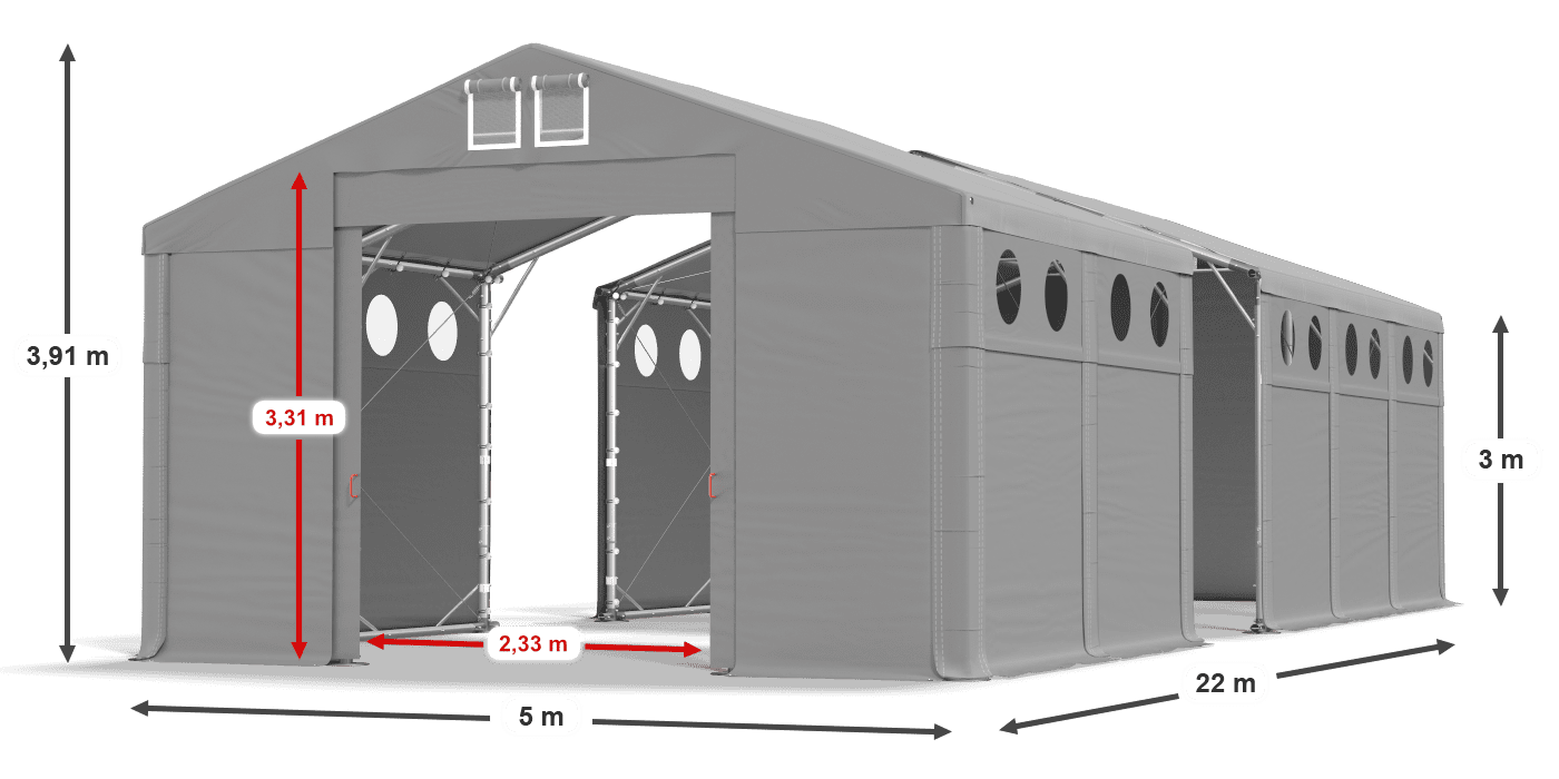 Opláštění s osvětlujícími okny zaručuje dodávku denního světla do vnitřku úložného stanu. Pevný tarpaulin PVC je odolný vůči vlhkosti a UV záření. Pod střechou můžete ukládat zboží, provádět opravy a provádět práce související s výrobou a segregací. Otečení bylo vybaveno systémem snadné změny délky Multi-size. Malá kulatá okna jsou umístěna do horní části bočních stěn, a proto není pro kolemjdoucí viditelný interiér garážového stanu.