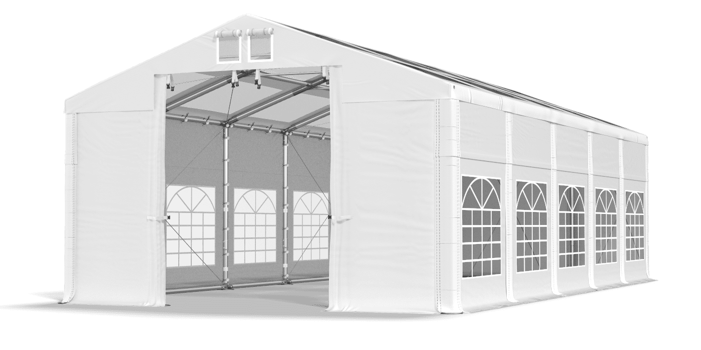 Tarpaulin vybavený okny vitráže a průhledná střecha zajišťuje optimální osvětlení stolů a bufetů během večírků ve večírku. Silné opláštění s PVC chrání před vlhkostí, větrem a UV zářením. V případě stanu můžete organizovat rodinné oslavy, firemní bankety, festivaly a výstavy. Je to také vynikající zahradní stan a komerční stan. Otečení bylo vybaveno systémem snadné změny délky Multi-size.