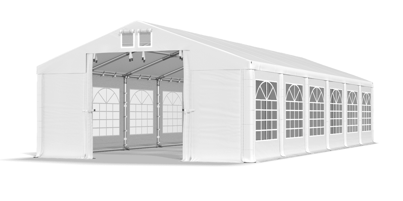 Silný tarpaulin je vyroben z PVC s vysokou hmotností. Má estetická okna vitráže, která poskytují hodně denního světla. Elegantní opláštění se používá ve stranických stanech, gastronomických stanech a obchodních stanech. Vodotěsný a UV -rezistentní plachta chrání stoly a bufety a poskytuje hostům suchý a stinný prostor. Stan s okny z vitráže je také vynikající zahradní altán.