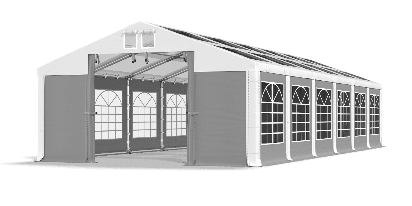 Boční stěna je vyrobena ze silné plachty PVC cca. 500 g/m2 a velká vitrážová okna. Výška základní stěny je 2m. Díky unikátní konstrukci je možné boční stěnu snadno zvednout o 0,5 m nebo 1 m. Díky oknům umístěným na každém dvoumetrovém segmentu působí stan esteticky. Skvěle se hodí jako komerční, výstavní nebo párty stan.