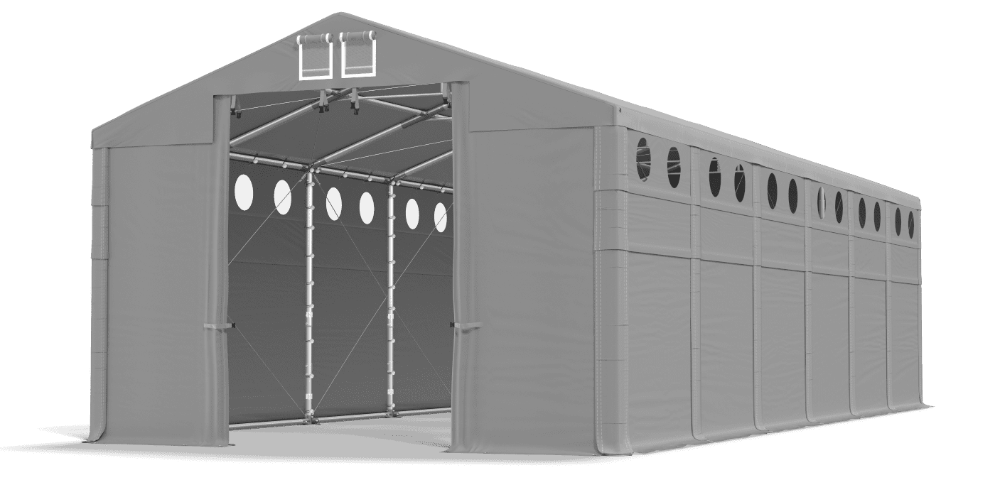 Tarpaulin s osvětlovacími okny zaručuje dodávku přirozeného světla. Opád je vyroben z PVC s vysokou hmotností, která je vodotěsná a odolná vůči UV záření. Díky tomu můžeme pod střechou ukládat různé zboží, stavební materiály a suroviny. Jsou to také vynikající garážové stany pro vozidla a sportovní vybavení. Malá osvětlovací okna jsou umístěna v horní části plachty, díky nimž se lidé zvenčí nemohou podívat do skladu.
