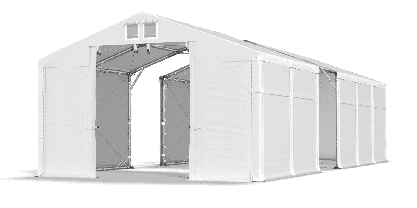 Odolný, tvrdý tarpaulin tarpaulin z PVC poskytuje bezpečné podmínky pro skladování stavebních materiálů, komerčního zboží, vozidel a zemědělských strojů. Full -bez opláštění bez oken je extrémně těsné, vodotěsné a neprochází denním světlem. Interiér skladového stanu je pro kolemjdoucí neviditelný. Jedná se o vynikající garážový stan a průmyslová hala. Tarpaulin má systém rychlé délky změny Multi-size.