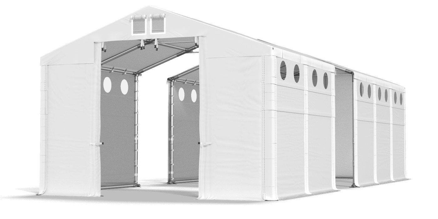 Opláštění s osvětlujícími okny zaručuje dodávku denního světla do vnitřku úložného stanu. Pevný tarpaulin PVC je odolný vůči vlhkosti a UV záření. Pod střechou můžete ukládat zboží, provádět opravy a provádět práce související s výrobou a segregací. Otečení bylo vybaveno systémem snadné změny délky Multi-size. Malá kulatá okna jsou umístěna do horní části bočních stěn, a proto není pro kolemjdoucí viditelný interiér garážového stanu.