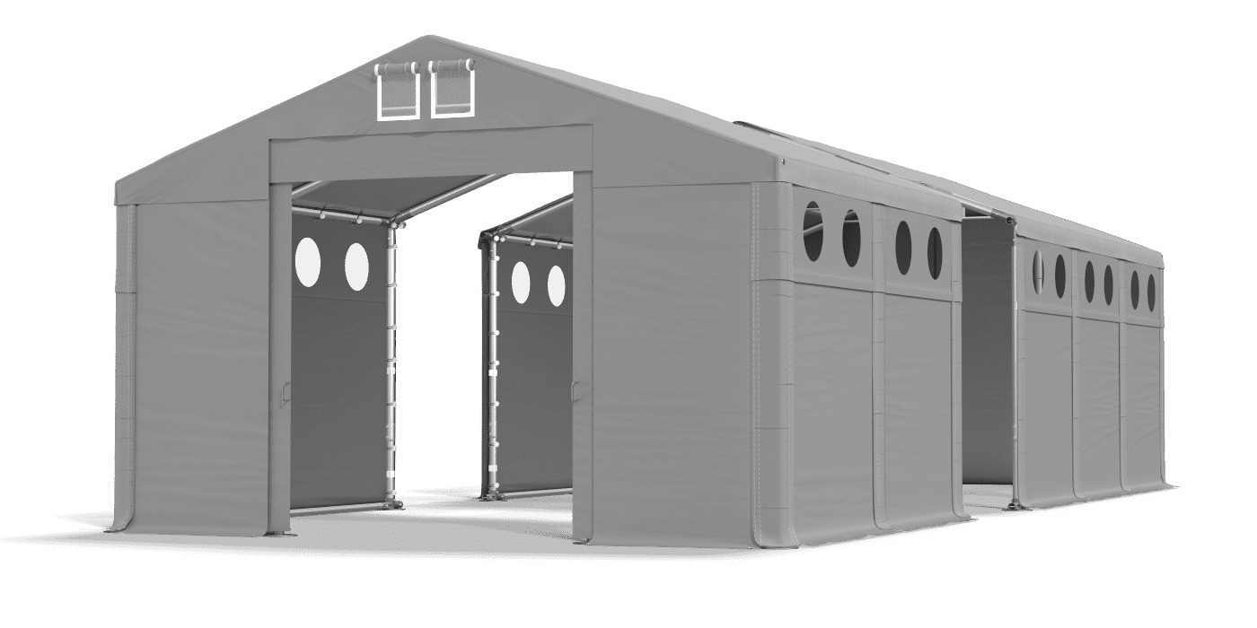 Tento typ stanů dobře poslouží jako dílenský stan, ve kterém probíhají například svářečské práce. V horní části přístřešku jsou kulatá okénka, díky kterým dochází dovnitř stanu k přílivu denního světla.