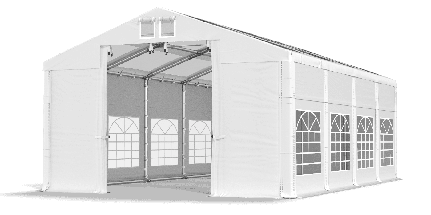 Tarpaulin vybavený okny vitráže a průhledná střecha zajišťuje optimální osvětlení stolů a bufetů během večírků ve večírku. Silné opláštění s PVC chrání před vlhkostí, větrem a UV zářením. V případě stanu můžete organizovat rodinné oslavy, firemní bankety, festivaly a výstavy. Je to také vynikající zahradní stan a komerční stan. Otečení bylo vybaveno systémem snadné změny délky Multi-size.