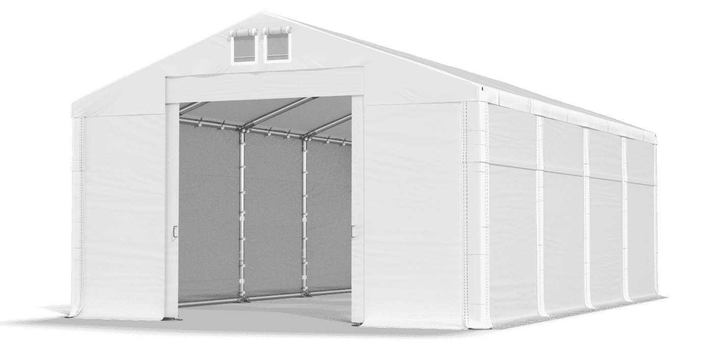 Odolný, tvrdý tarpaulin tarpaulin z PVC poskytuje bezpečné podmínky pro skladování stavebních materiálů, komerčního zboží, vozidel a zemědělských strojů. Full -bez opláštění bez oken je extrémně těsné, vodotěsné a neprochází denním světlem. Interiér skladového stanu je pro kolemjdoucí neviditelný. Jedná se o vynikající garážový stan a průmyslová hala. Tarpaulin má systém rychlé délky změny Multi-size.
