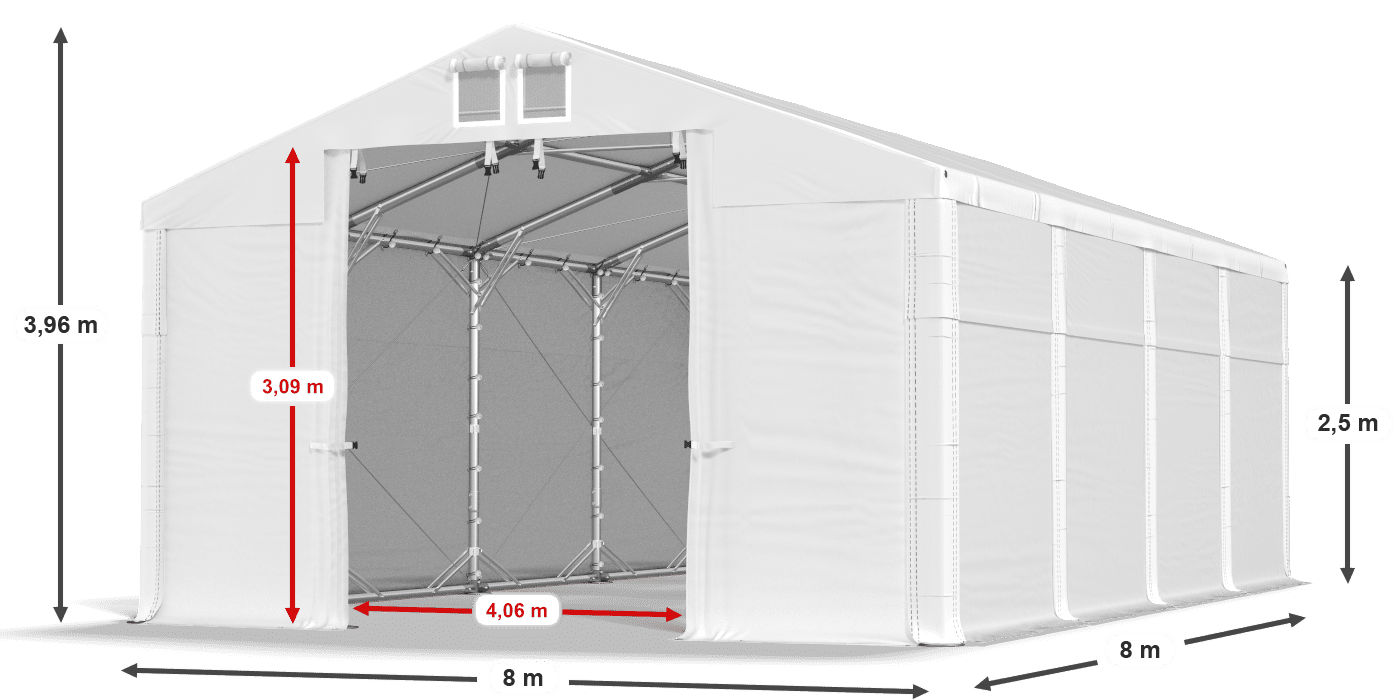 Odolný, tvrdý tarpaulin tarpaulin z PVC poskytuje bezpečné podmínky pro skladování stavebních materiálů, komerčního zboží, vozidel a zemědělských strojů. Full -bez opláštění bez oken je extrémně těsné, vodotěsné a neprochází denním světlem. Interiér skladového stanu je pro kolemjdoucí neviditelný. Jedná se o vynikající garážový stan a průmyslová hala. Tarpaulin má systém rychlé délky změny Multi-size.