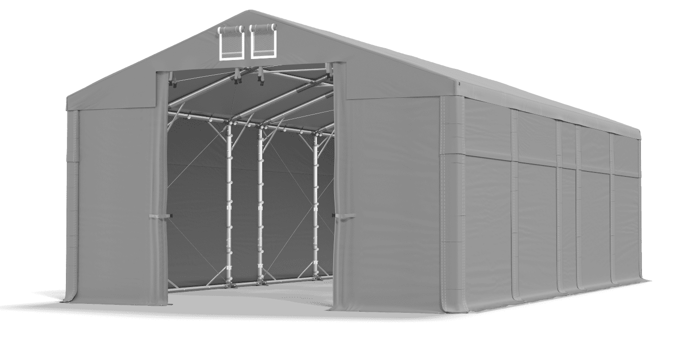 Odolný, tvrdý tarpaulin tarpaulin z PVC poskytuje bezpečné podmínky pro skladování stavebních materiálů, komerčního zboží, vozidel a zemědělských strojů. Full -bez opláštění bez oken je extrémně těsné, vodotěsné a neprochází denním světlem. Interiér skladového stanu je pro kolemjdoucí neviditelný. Jedná se o vynikající garážový stan a průmyslová hala. Tarpaulin má systém rychlé délky změny Multi-size.