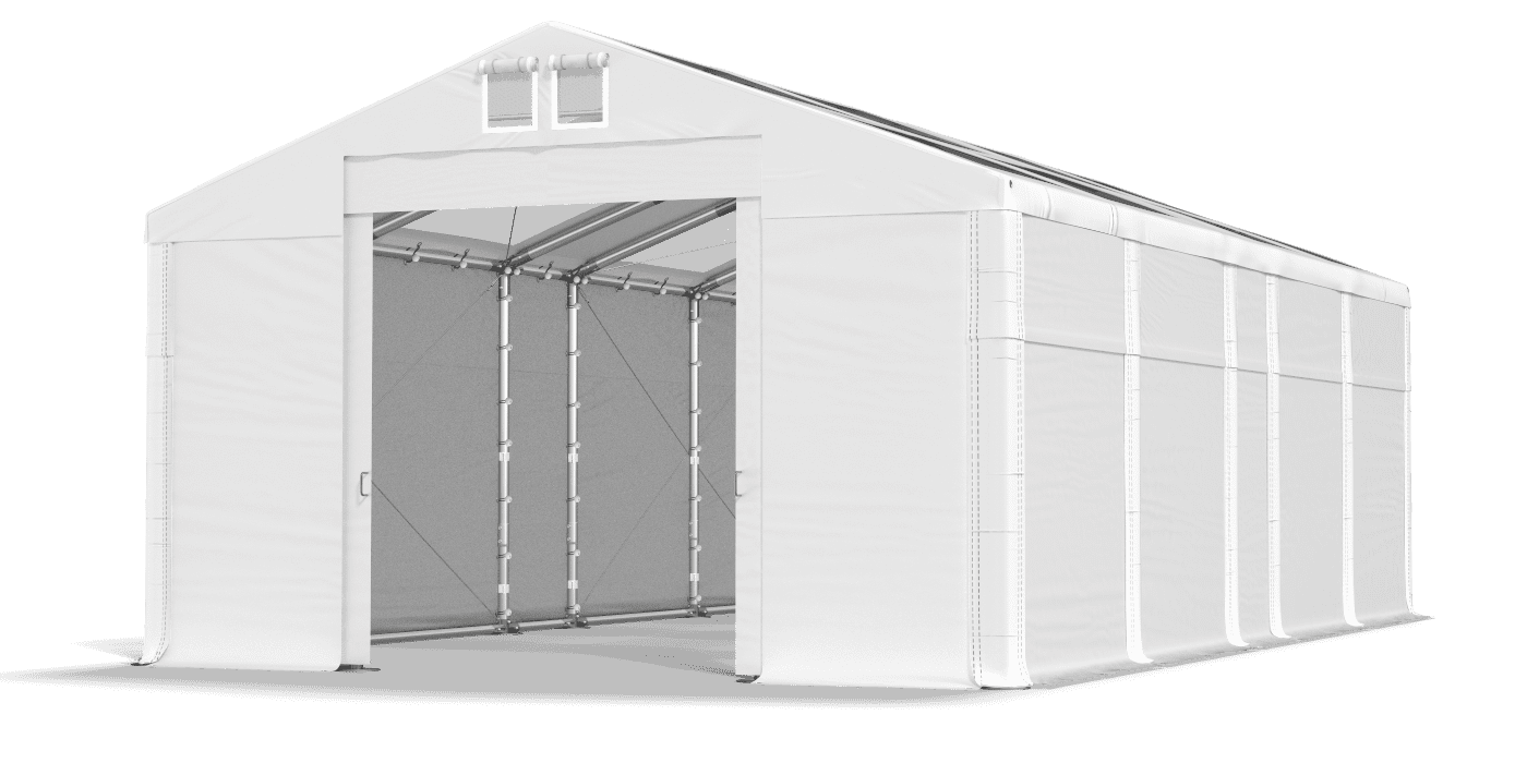 Tarpaulin má plné stěny a průhlednou střechu. Zaručuje perfektní osvětlení interiéru skladového stanu a zabraňuje nahlédnutí do jeho vnitřku vůči kolemjdoucím. Jedná se o vynikající průmyslový stan pro provádění práce souvisejících s výrobou, opravou, segregací a sestavením. V garáži můžeme ukládat komerční zboží, vozidla, sportovní vybavení a zemědělské stroje. Otečení bylo vybaveno systémem změny snadné délky Multi-size.