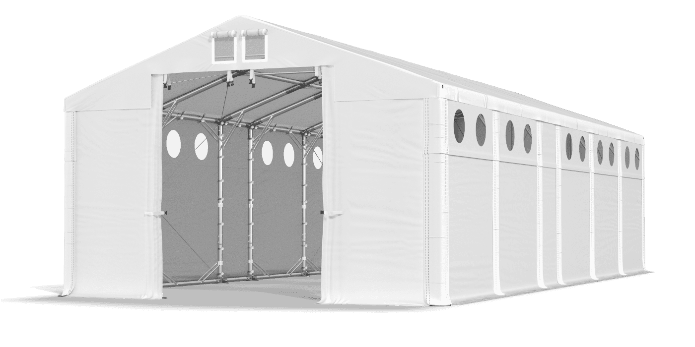 Silné opláštění s osvětlujícími okny umožňuje garáž vozidel, skladování zboží a provádění prací souvisejících s montáží. Tvrdý -tarpaulin tarpaulin vyrobený z PVC je nepromokavý, těsný a odolný vůči UV záření. V suchém a stínovaném skladovém stanu můžeme ukládat plodiny, stavební materiály a suroviny. Okna kulatého osvětlení poskytuje přirozené světlo. Tarpaulin má systém rychlé délky změny Multi-size.